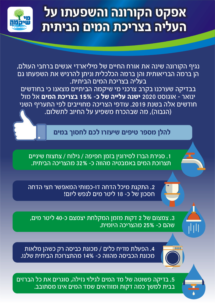 נגיף הקורונה שינה את אורח החיים של מיליארדי אנשים ברחבי העולם, הן ברמה הבריאותית והן ברמה הכלכלית וניתן להרגיש את השפעתו גם בעליה בצריכת המים הביתית. מחקרים ברחבי העולם מצאו כי, מגיפת הקורונה גרמה לעליה בביקוש למים למגורים ואילו מאידך גרמה לירידה בביקוש למים לעסקים.